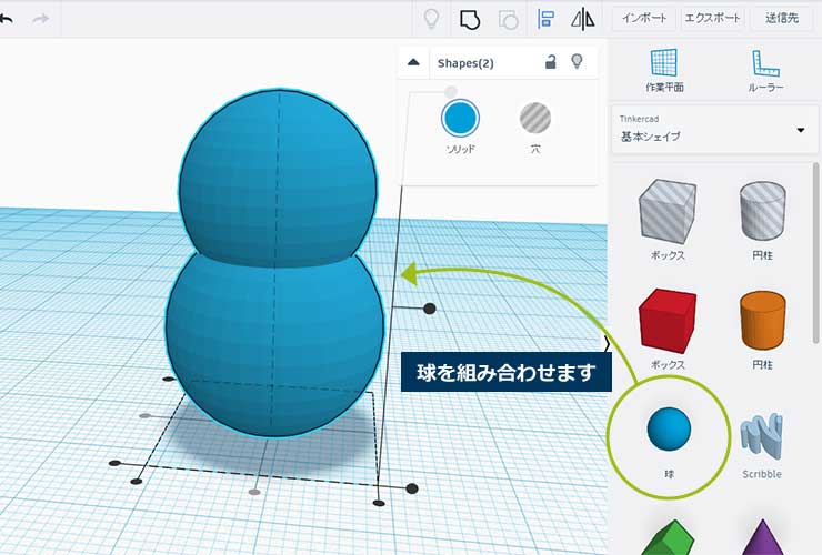 まずは球体をふたつ組み合わせ合体させます。