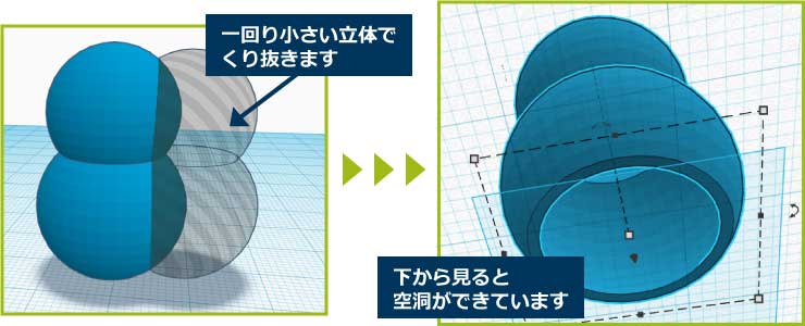それをコピーして一回り小さくし、くり抜きます。あとは底を削ってLEDランプを入れる穴を作ります。以上で雪だるまキャンドルの完成です!!!